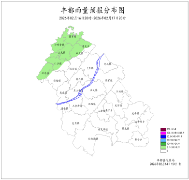 2026年2月13日16时至2月14日16时我县多云间晴。最低气温-6.1 (太平坝)~7.6℃,最高气温15.4~24.6℃(江池)。丰都国家基本站最低气温6.6℃,最高气温18.0℃。