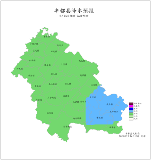 2026年2月23日16时至2月24日16时我县阵雨转多云间晴。最大降雨量为28.2mm(武平峰子山),最大小时雨强为13.7毫米(武平峰子山,23日19时)。最低气温6.1 (南天湖景区)~16.3℃,最高气温10.8~26.5℃(城区站)。丰都国家基本站最低气温14.2℃,最高气温23.9℃。