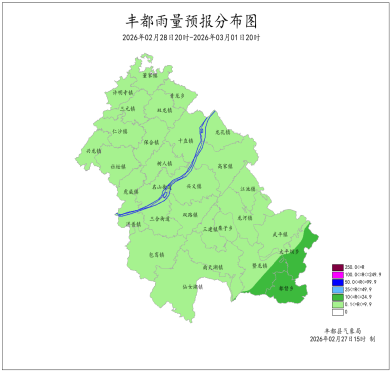 2026年2月20日16时至2月27日16时我县晴雨相间。最大周累计降雨量为30.5mm(武平峰子山)。最低气温-2.6(太平坝)~10.9℃,最高气温15.2~29.0℃(兴龙)。仙女湖、武平出现7-9级大风,极大风速21.1米/秒(武平峰子山,23日04时)。丰都国家基本站周累计降雨量1.4mm,最低气温8.9℃,最高气温25.0℃。