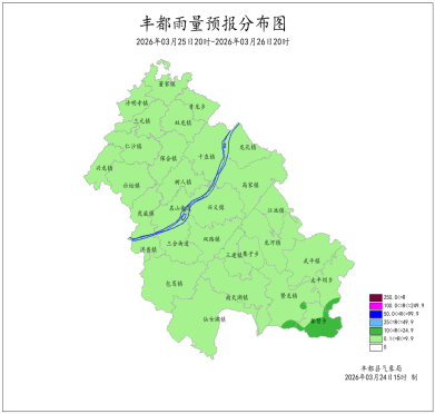 2026年3月23日16时至3月24日16时我县阴天有小雨。最大降雨量为11.9mm(江池横梁);最低气温5.7 (南天湖景区)~14.5℃,最高气温7.6~18.2℃(名山镇(航道))。丰都国家基本站雨量5.2mm,最低气温13.2℃,最高气温15.6℃。