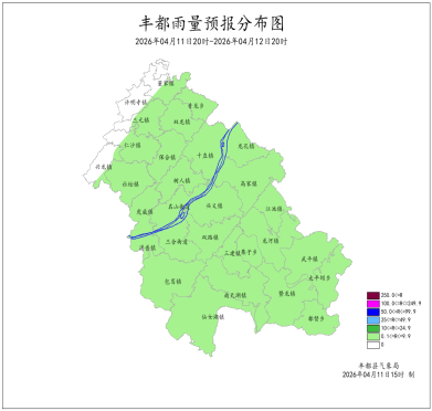 2026年4月10日16时至4月11日16时我县阵雨。最大降雨量为53.0mm(栗子);最低气温8.0 (南天湖景区)~16.6℃,最高气温15.9~26.4℃(双路凉水井)。暨龙、高家、双路、名山、丰都、十直、龙河出现7级大风,极大风速15.8米/秒(龙河,10日17时)。丰都国家基本站雨量20.2mm,最低气温15.1℃,最高气温23.4℃。