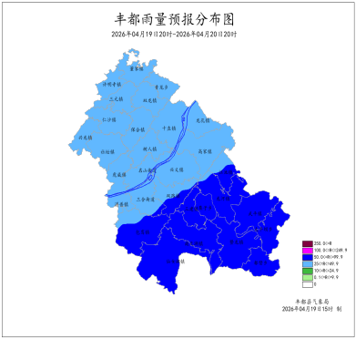2026年4月18日16时至4月19日16时我县多云间晴。最低气温7.9 (太平坝)~22.4℃,最高气温16.7~34.6℃(三元)。丰都国家基本站最低气温19.0℃,最高气温29.6℃。