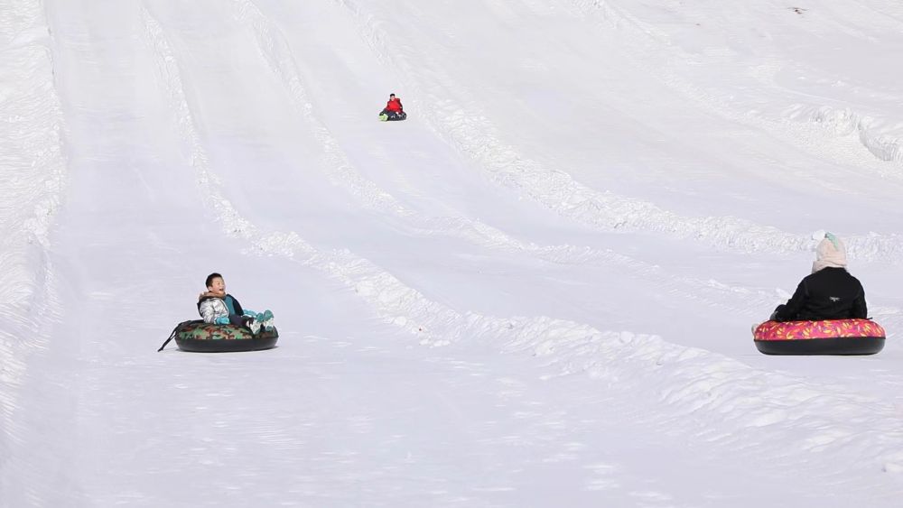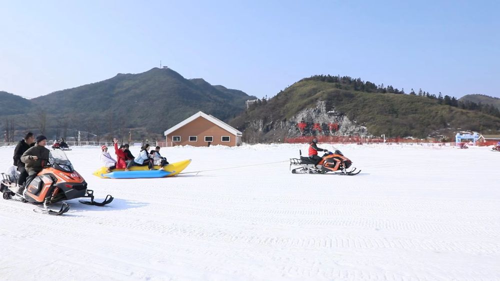 游客在南天湖冰雪乐园体验雪地摩托和雪地香蕉船。