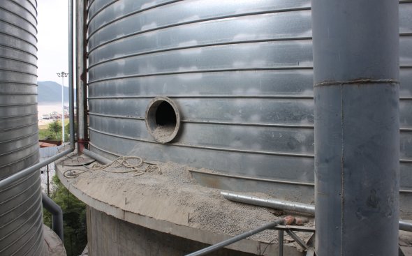 原料库位于丰都县高家镇汶溪码头,距重庆绿岛源建材集团有限公司矿山约15公里。2022年1月,重庆绿岛源建材集团有限公司与河南万仕衡通智能装备有限公司签订了《建筑安装工程承包合同》,合同委托其对项目进行勘察、设计、采购、施工、试运行等多个项目。2022年8月,河南万仕衡通智能装备有限公司委托重庆中誉鼎力机械设备有限公司进行了设备安装,设计库体直径15m,高度23m,有效容重5000吨。2024年8月原料库建成调试,2024年12月调试结束,2025年5月进行试生产。